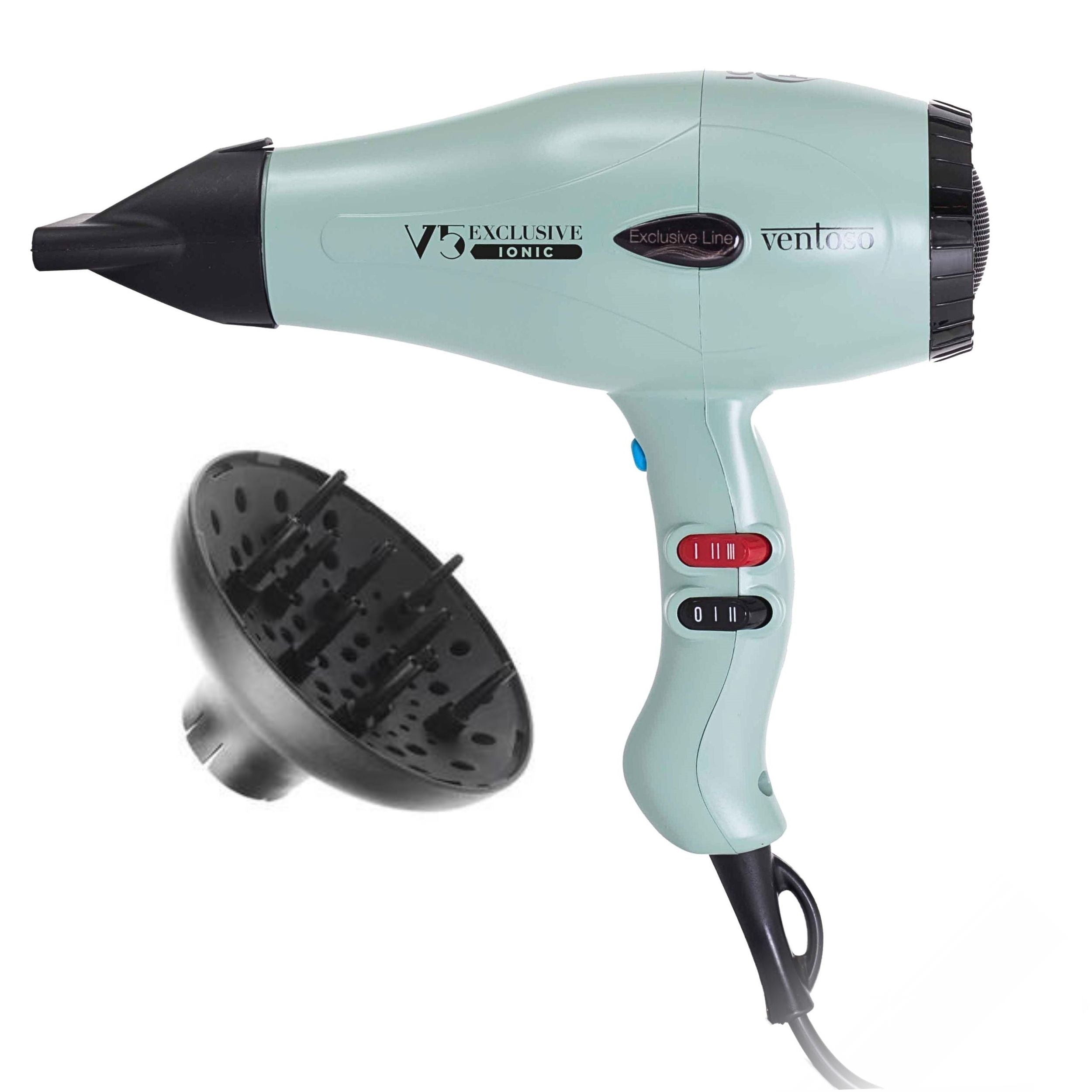 Gli asciugacapelli professionali Ventoso Exclusive Ionic, dotati di una potenza di 2500 W e di un livello di silenziosità di 63 dB, nonché di un generatore di ioni certificato TÜV, creano 20 milioni/cm3 di ioni negativi se applicati a una distanza di 10 cm.
